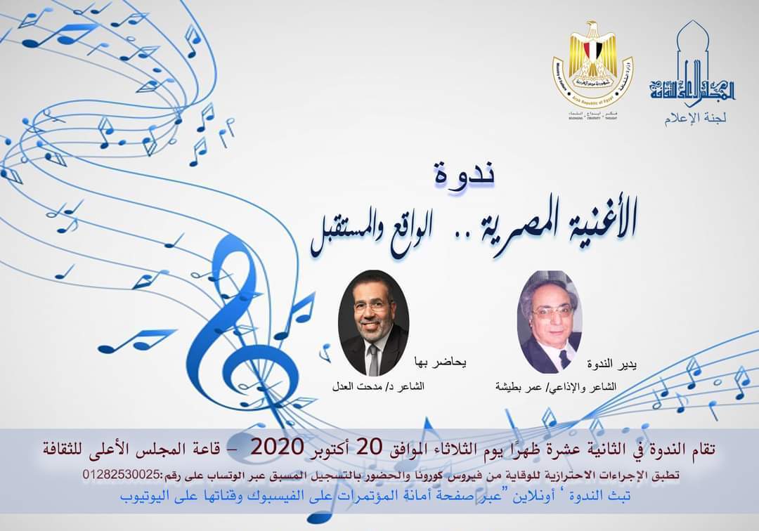 يناقش المجلس الأعلي للثقافة، بأمانة الدكتور هشام عزمي ، بالتعاون مع لجنة الإعلام بالمجلس ومقررتها الدكتورة درية شرف الدين، "الأغنية المصرية بين الواقع والمستقبل"؛ وذلك في تمام الساعة الثانية عشرة ظهر غد الثلاثاء.