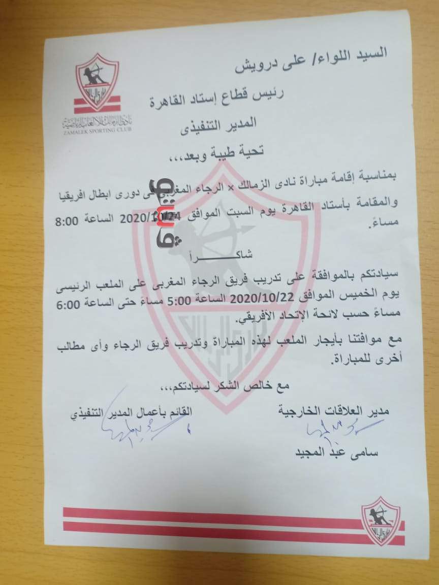 تلقت هيئة ستاد القاهره الدولي خطابا رسميا من ادارة نادي الزمالك حددت خلاله الثامنة مساء السبت المقبل موعدا للقاء فريق القلعه البيضاء مع الرجاء المغربي في اياب نصف نهائي دوري ابطال افريقيا مع طلب السماح لفريق الرجاء باداء مرانه الرئيسي على الملعب الرئيسي لاستاد القاهره الثامنه مساء الخميس المقبل حسب لوائح الاتحاد الافريقي لكرة القدم.