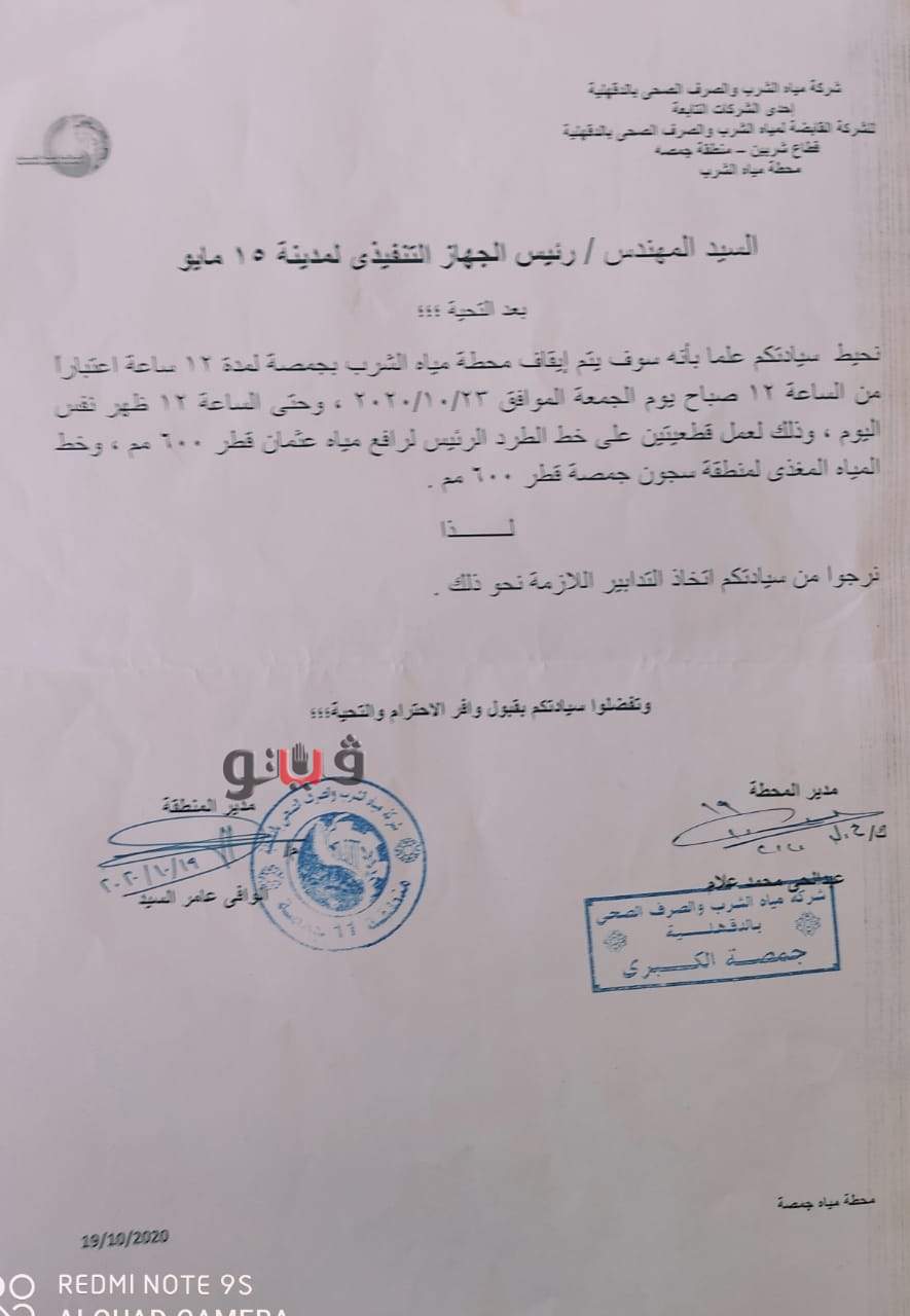 أعلنت رئاسة مجلس مدينة جمصة بمحافظة الدقهلية عن أنه سوف يتم قطع مياه الشرب بمدينة 15 مايو و منطقة سجون جمصة لمدة 12 ساعة .