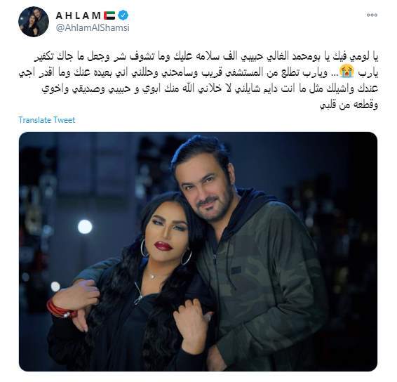 طلبت الفنانة الإماراتية أحلام من زوجها أن يسامحها لبعدها عنه، بالرغم من دخوله المستشفى، ودعت له أن يخرج قريبًا من المستشفى ويتعافى، وغازلته قائلة " ابوي وحبيبي وصديقي واخوي وقطعه من قلبي".