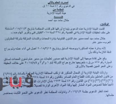 وأصدرت المحكمة حكمها بحضور المستشار فوزي عبد الهادي، ممثل النيابة الإدارية بمجازاة طلال حامد سيد، مدير عام الشئون القانونية بإدارة المعدات والشدات المنزلقة بشركة المقاولون العرب بغرامة تعادل الأجر الإجمالي الذي كان يتقاضاه في الشهر عند تركه الخدمة.