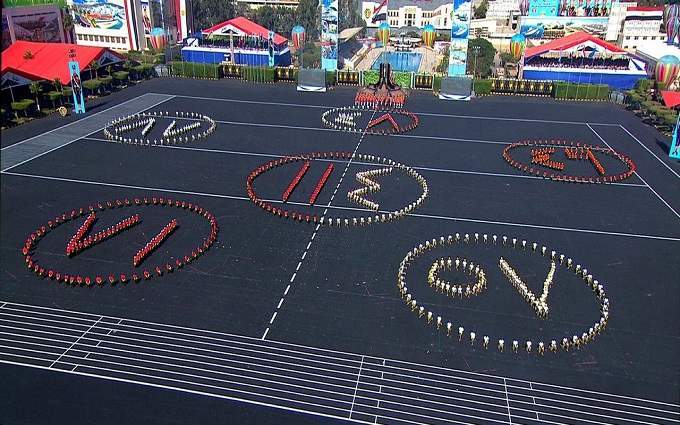 وبدأ العرض العسكري بدخول طلبة الكليات العسكرية والمعهد الفني للقوات المسلحة إلى ساحة العرض يحملون الأعلام، وقاموا بالمرور أمام المنصة تحية للرئيس عبد الفتاح السيسي، وعقب ذلك "سلام الشهيد" مع إطلاق بالونات زينت سماء العرض تحمل صور الشهداء الذين ضحوا بأرواحهم فداء للوطن، ورفرفت حولهم حمامات السلام.