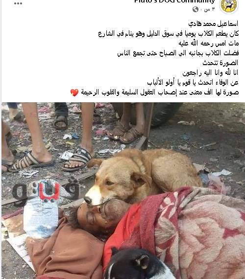 تداول نشطاء مواقع التواصل الاجتماعي "فيس بوك" صورة لأحد الأشخاص يدعى إسماعيل محمد هادي، بعد وفاته في الشارع وبجواره الكلاب التي كان يقدم لها الطعام يوميا.