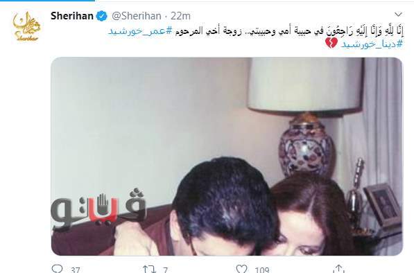 أعلنت الفنانة شيريهان وفاة دينا خورشيد زوجة شقيقها الفنان الراحل عمر خورشيد عبر صفحتها الشخصية على موقع التواصل الاجتماعي "تويتر".