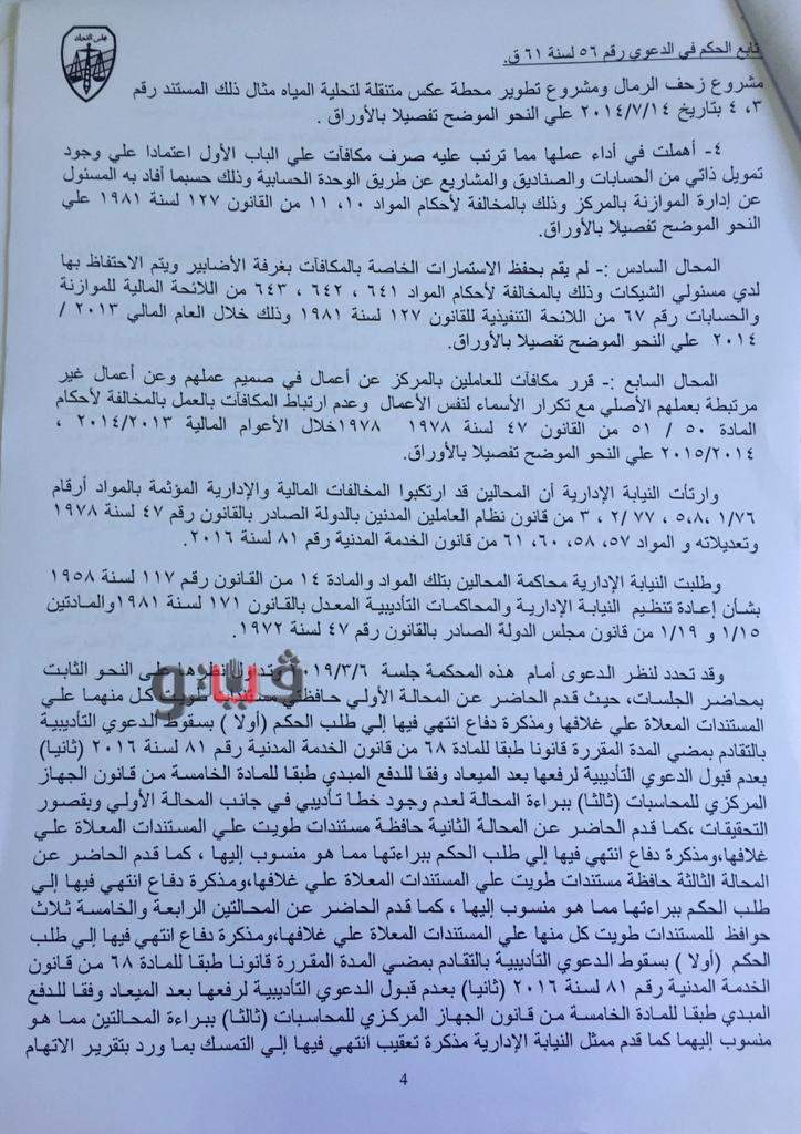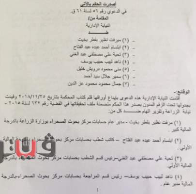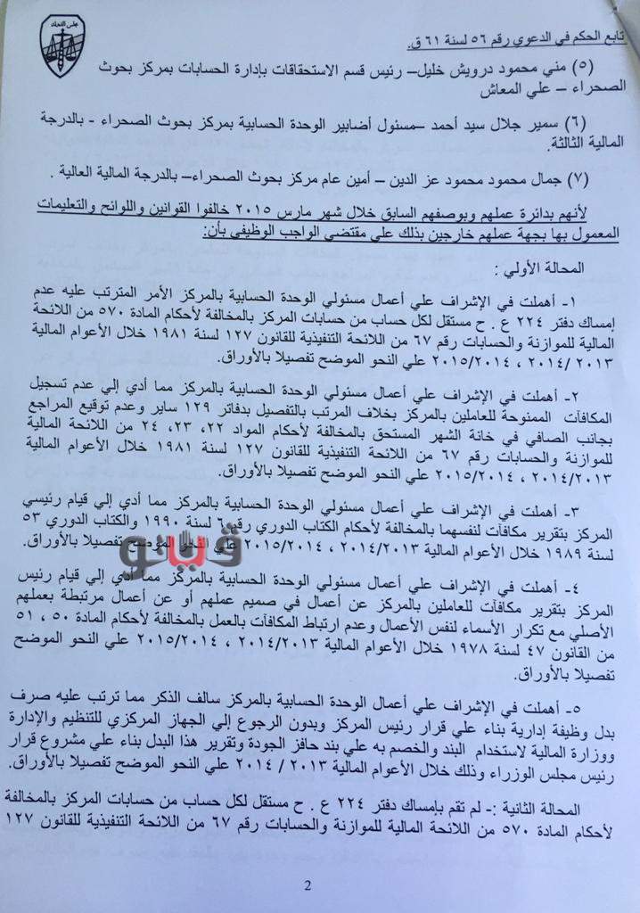 وقضت المحكمة بمجازاة ميرفت نظير بقطر، مدير عام حسابات مركز بحوث الصحراء بعقوبة الغرامة التي تعادل ثلاثة أمثال الأجر الوظيفي الذي كانت تتقاضاه في الشهر عند انتهاء خدمتها لإهمالها في الإشراف على أعمال مسئولي الوحدة الحسابية مما ترتب عليه عدم امساك دفتر 244 ع ح مستقل لكل حساب من حسابات المركز، وعدم تسجيل المكافأت الممنوحة للعاملين بخلاف المرتب بالتفصيل بدفاتر 129 ساير.