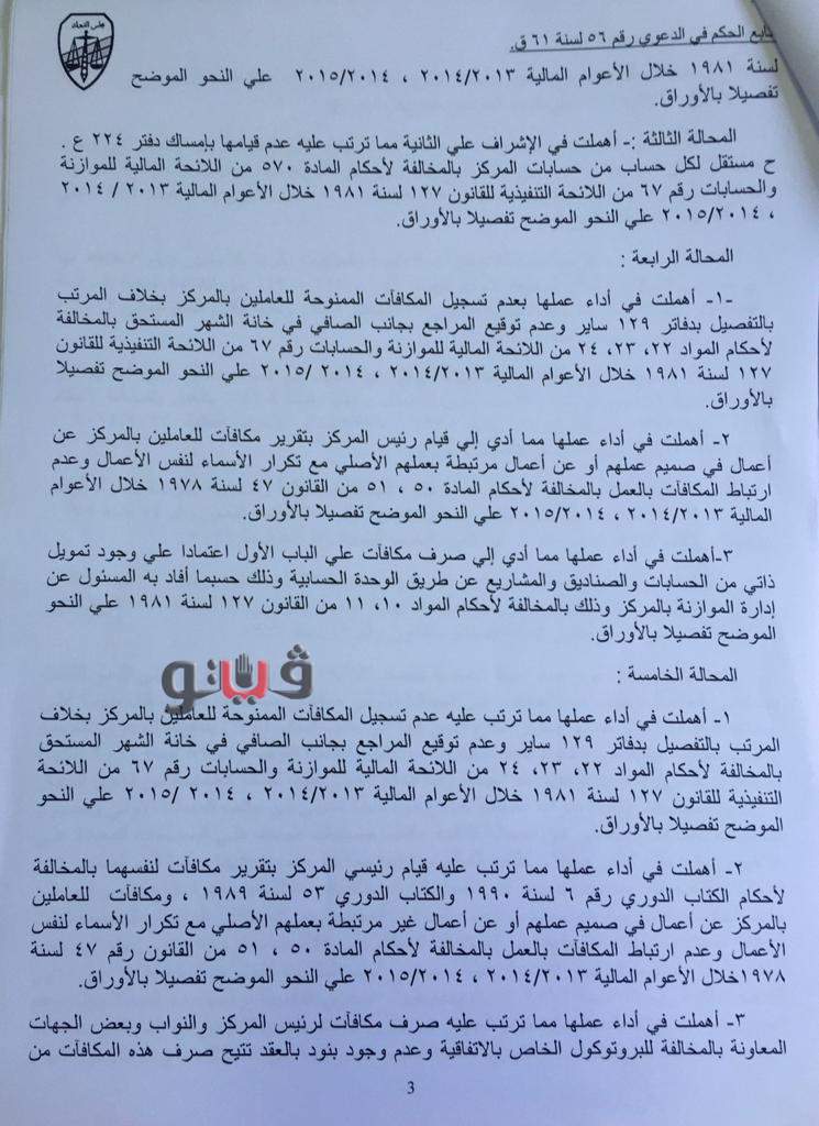 وعاقبت المحكمة ناهد لبيب حبيب، رئيس قسم المراجعة بخصم أجر 15 يومًا من راتبها لعدم قيامها بتسجيل المكافأت الممنوحة للعاملين بالمركز بخلاف المرتب بالتفصيل بدفاتر 129 ساير، بالإضافة إلى عدم توقيع المراجع بجوار الصافي بخانة الشهر المستحق، وقيام رئيس المركز بتقرير مكافأت للعاملين بالمركز عن أعمال في صميم عملهم، وأعمال غير مرتبطة بعملهم الأصلي مع تكرار الأسماء لنفس الأعمال، وصرف مكافأت على الباب الأول إعتمادًا على وجود تمويل ذاتي من الحسابات والصناديق والمشاريع عن طريق الوحدة الحسابية.