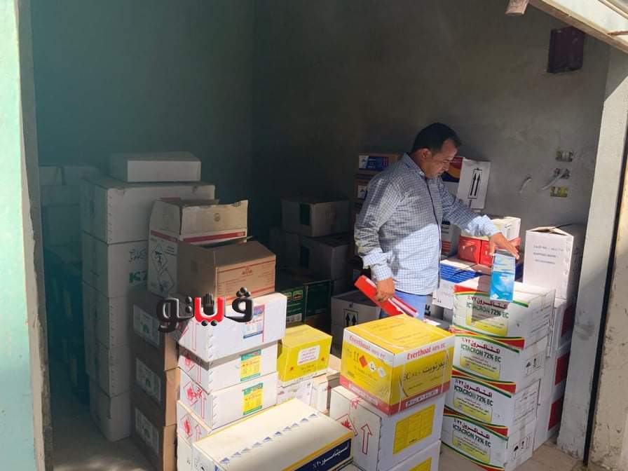 كما تم ضبط ٣ مخازن أسمدة و مبيدات بدون ترخيص و بها 11.162طن أسمدة مجهولة المصدر و 1.687طن مبيدات مجهولة المصدر، و١١كرتونة شيبسي ، وسناكس .