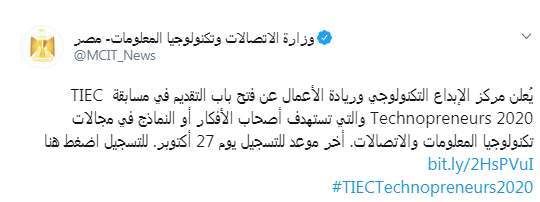 وكتبت وزارة الاتصالات وتكنولوجيا المعلومات تغريدة على تويتر "يُعلن مركز الإبداع التكنولوجي وريادة الأعمال عن فتح باب التقديم في مسابقة TIEC Technopreneurs 2020 والتي تستهدف أصحاب الأفكار أو النماذج في مجالات تكنولوجيا المعلومات والاتصالات. أخر موعد للتسجيل يوم 27 أكتوبر"
