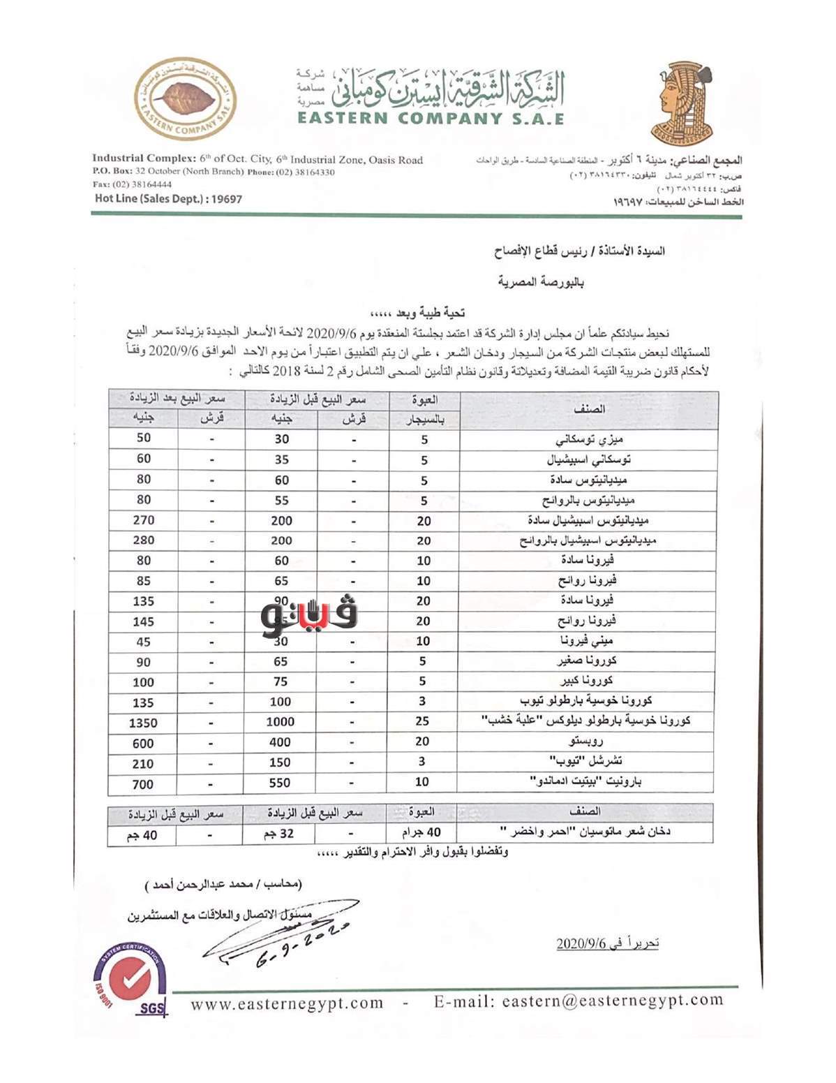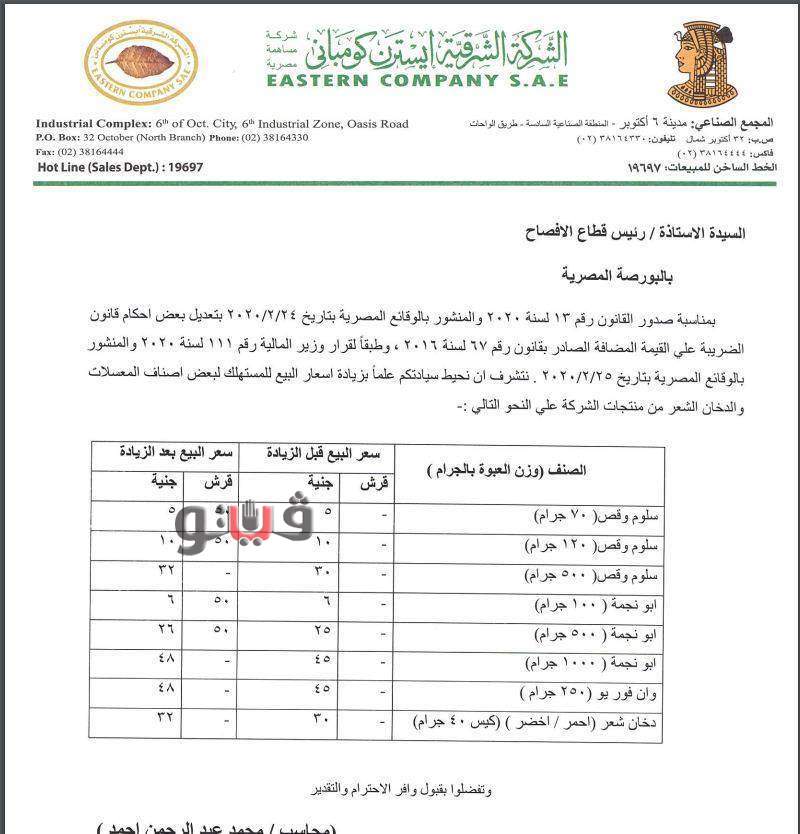 تقوم الشركة الشرقية للدخان ايسترن كومبانى بتحريك اسعار منتجاتها من وقت لاخر حيث قامت اليوم برفع الاسعار لبعض المنتجات وفقا لاحكام قانون ضريبة القيمة المضافة وتعديلاته وقانون التامين الصحى الشامل رقم 2 لسنة 2018 .
