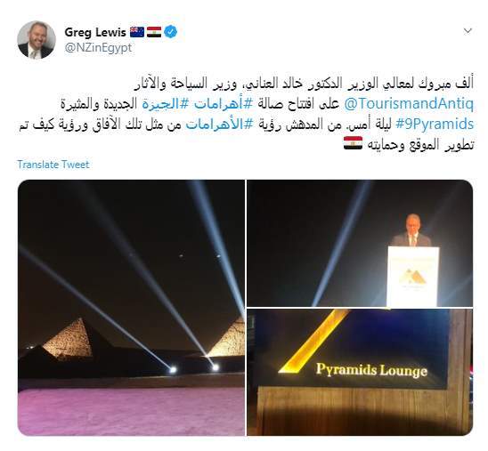 هنأ سفير نيوزلندا بالقاهرة جرج لويس وزير الآثار والسياحة خالد العناني على افتتاح صالة أهرامات بالجيزة الجديدة، ووصفها بالمثيرة، والتي افتتحت أمس الثلاثاء.