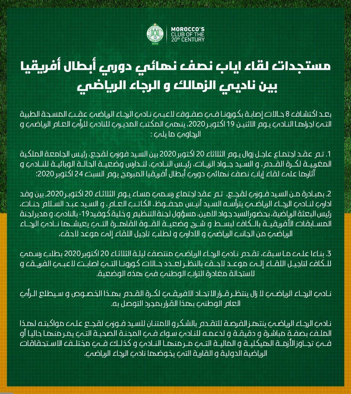بعد اكتشاف 8 حالات إصابة بكورونا في صفوف لاعبي نادي الرجاء الرياضي عقب المسحة الطبية التي اجراها النادي يوم 19 أكتوبر 2020.