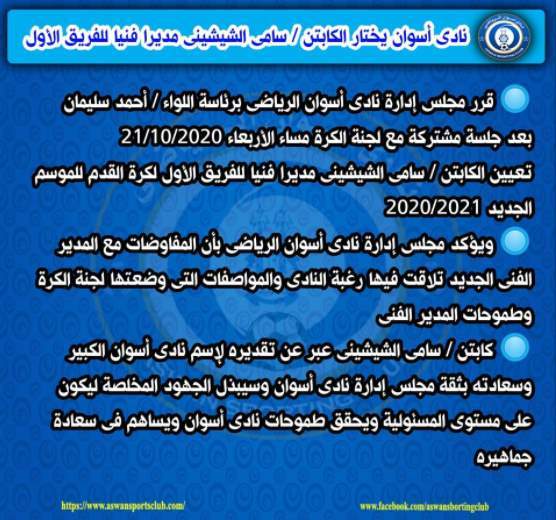 وأكد نادي أسوان في بيان رسمي مساء اليوم تولي سامي الشيشيني مسئولية القيادة الفنية لفريق الكرة.