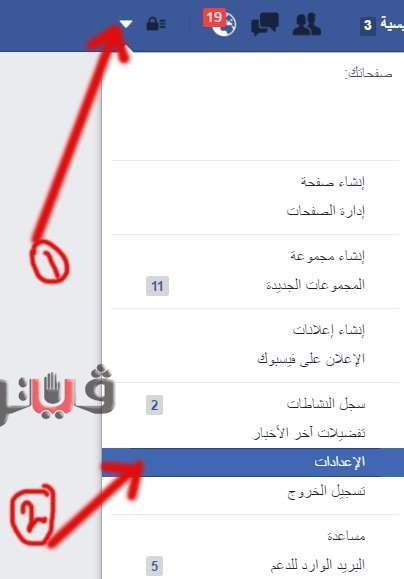 2- اضغط على خيار (الإعدادات) Settings، من السهم المتجه لأسفل في أعلى الجهة اليمنى من صفحة فيسبوك الرئيسية.