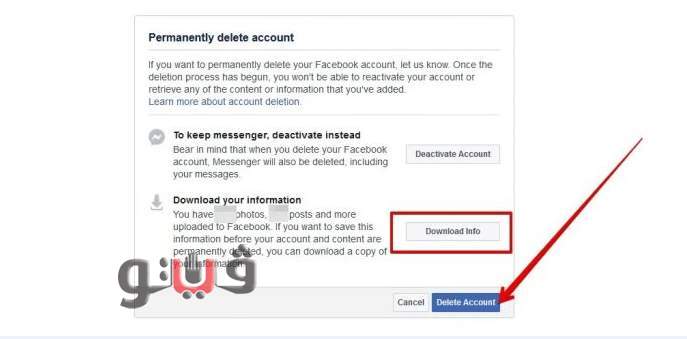7- إذا كنت تريد حفظ هذه المعلومات قبل حذف حسابك والمحتوى نهائيًا، يمكنك تنزيل نسخة من معلوماتك بالضغط على زر (تنزيل البيانات) Download Info.