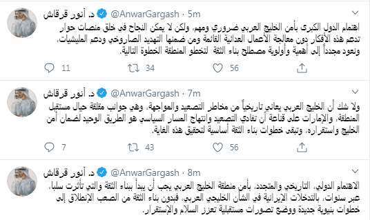 وكتب أنور قرقاش تغريدة على تويتر "الاهتمام الدولي، التاريخي والمتجدد، بأمن منطقة الخليج العربي يجب أن يبدأ ببناء الثقة والتي تأثرت سلبا، عبر سنوات، بالتدخلات الإيرانية في الشأن الخليجي العربي، فبدون بناء الثقة من الصعب الانطلاق إلى خطوات بنيوية جديدة ووضع تصورات مستقبلية تعزز السلام والاستقرار"