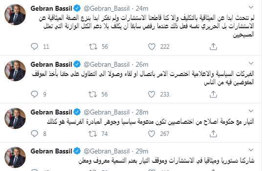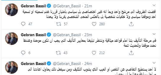 وكتب جبران باسيل تغريدة على تويتر "شاركنا دستوريا وميثاقيا في الاستشارات وموقف التيار بعدم التسمية معروف ومعلن".
