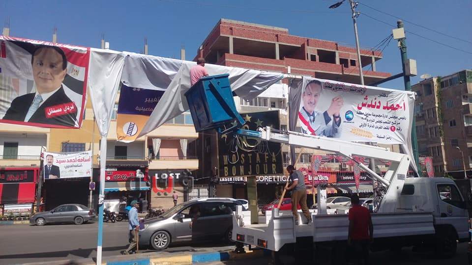 وقامت أطقم الحى بإزالة عدد من اللافتات الإعلانية لمرشحين بالشارع خلف نادى الكهرباء، وحتى منطقة معهد إعداد الدعاة وذلك بناء على شكوى الأهالي.