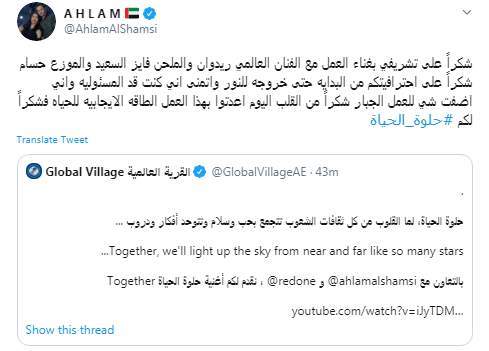 وجهت الفنانة الإماراتية أحلام رسالة شكر للقرية العالمية، لإطلاق أغنيتها الخاصة "حلوة الحياة"، التي أنتجت بالتعاون مع مجموعة من المواهب المحلية والعالمية ومنهم الفنان العالمي ريدوان، لتكون الأغنية الرسمية الخاصة بالقرية على مدى مواسمها القادمة.