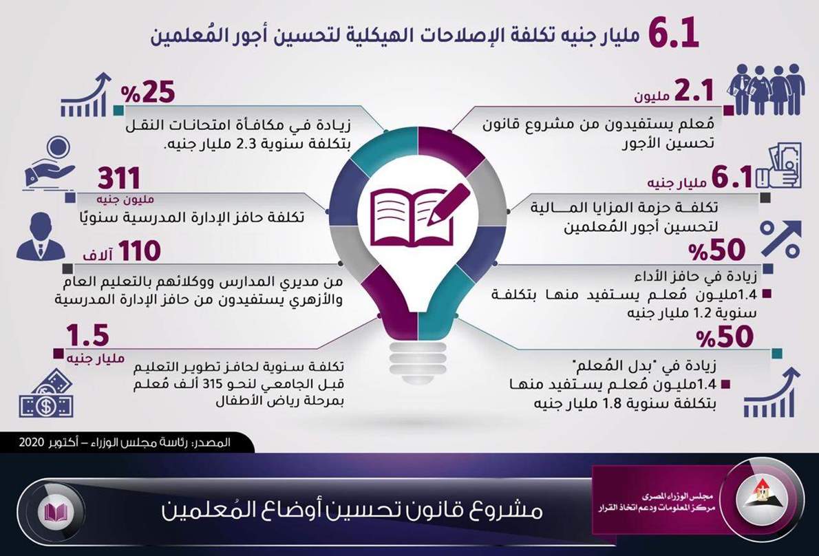 وسيصل عدد المعلمين المستفيدين من القانون ٢,١ مليون معلم، وقد بلغت تكلفة الإصلاحات الهيكلية لتحسين أجور المعلمين ٦,١ مليار جنيه.