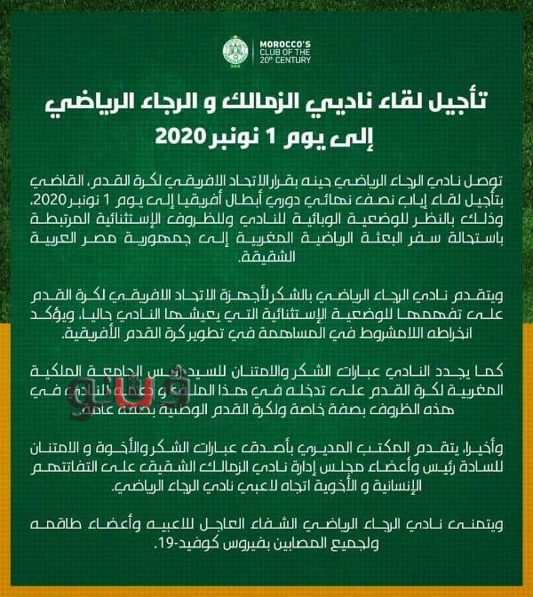 تقدم الرجاء المغربي بالشكر للاتحاد الإفريقي لكرة القدم (كاف)، اليوم الخميس، بعد قرار تأجيل مباراته أمام مضيفه الزمالك المصري، في إياب نصف نهائي دوري أبطال إفريقيا.