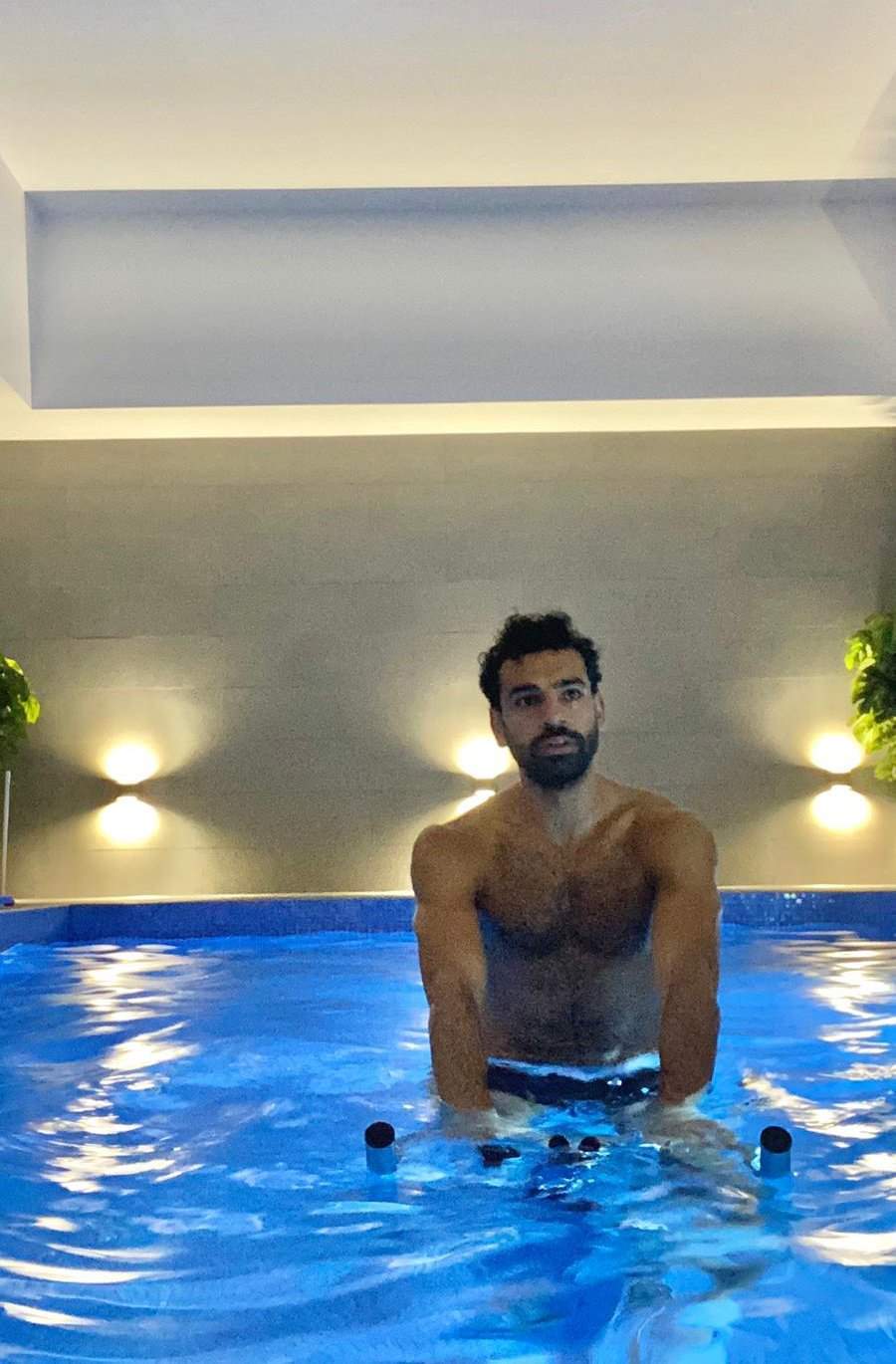 ونشر صلاح، عبر حسابه على انستجرام وتويتر، صورة خلال قيامه بالاستشفاء داخل حمام السباحة.