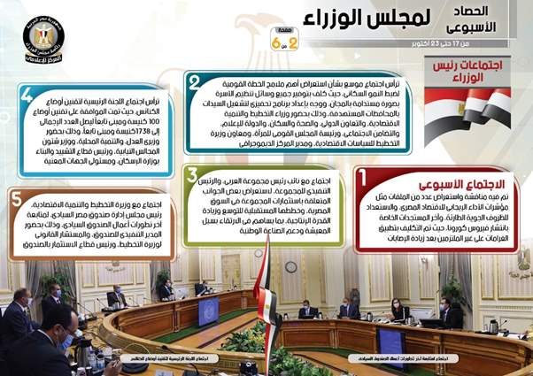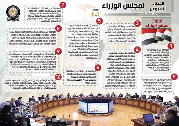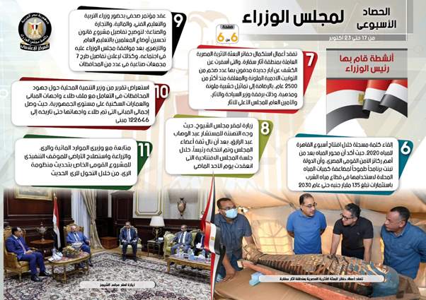 نشر المركز الإعلامي لمجلس الوزراء، تقريراً شمل إنفوجرافات سلط من خلالها الضوء على الحصاد الأسبوعي لمجلس الوزراء، وذلك خلال الفترة من 17 حتى 23 أكتوبر 2020، والذي تضمن الموافقة على عدد من القرارات، فضلاً عن الاجتماعات التي عقدها الدكتور مصطفى مدبولي، رئيس مجلس الوزراء، بالإضافة إلى ما قام به من أنشطة.