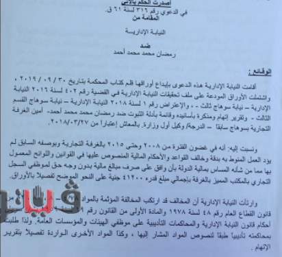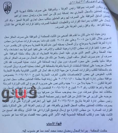 وأكدت المحكمة عبر أسباب حكمها عدم صحة ما جاء في تقرير الإتهام بأن رمضان محمد أحمد، أمين الغرفة التجارية بسوهاج "وكيل أول وزارة" خلال الفترة من عام ٢٠٠٨ حتى عام ٢٠١٥ لم طؤد العمل المنوط به بدقة وخالف القواعد والأحكام المالية المنصوص عليها في القوانين واللوائح المعمول بها مما ترتب عليه المساس بمصلحة مالية للدولة.