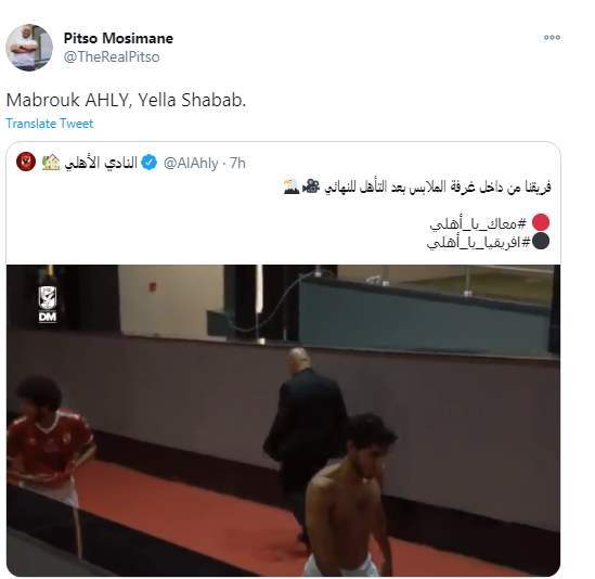 وكتب بيتسو موسيماني تغريدة على تويتر "مبروك الأهلي، يلا شباب"