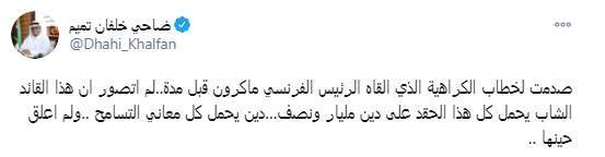 وكتب ضاحي خلفان تغريدة على تويتر: "صدمت لخطاب الكراهية الذي ألقاه الرئيس الفرنسي ماكرون قبل مدة..لم أتصور أن هذا القائد الشاب يحمل كل هذا الحقد على دين مليار ونصف المليار... دين يحمل كل معاني التسامح ..ولم أعلق حينها .."