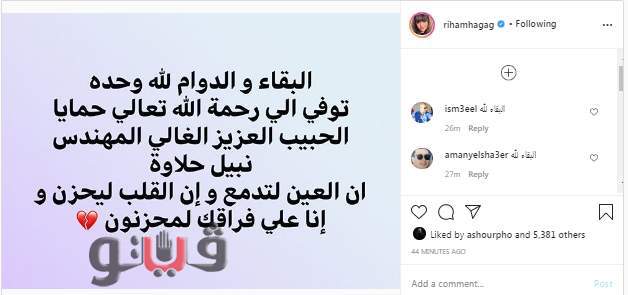 وكتبت ريهام: «البقاء والدوام لله وحده.. توفي إلي رحمة الله تعالي حمايا الحبيب العزيز الغالي المهندس نبيل حلاوة.. إن العين لتدمع وإن القلب ليحزن وإن على فراقك لمحزنون».