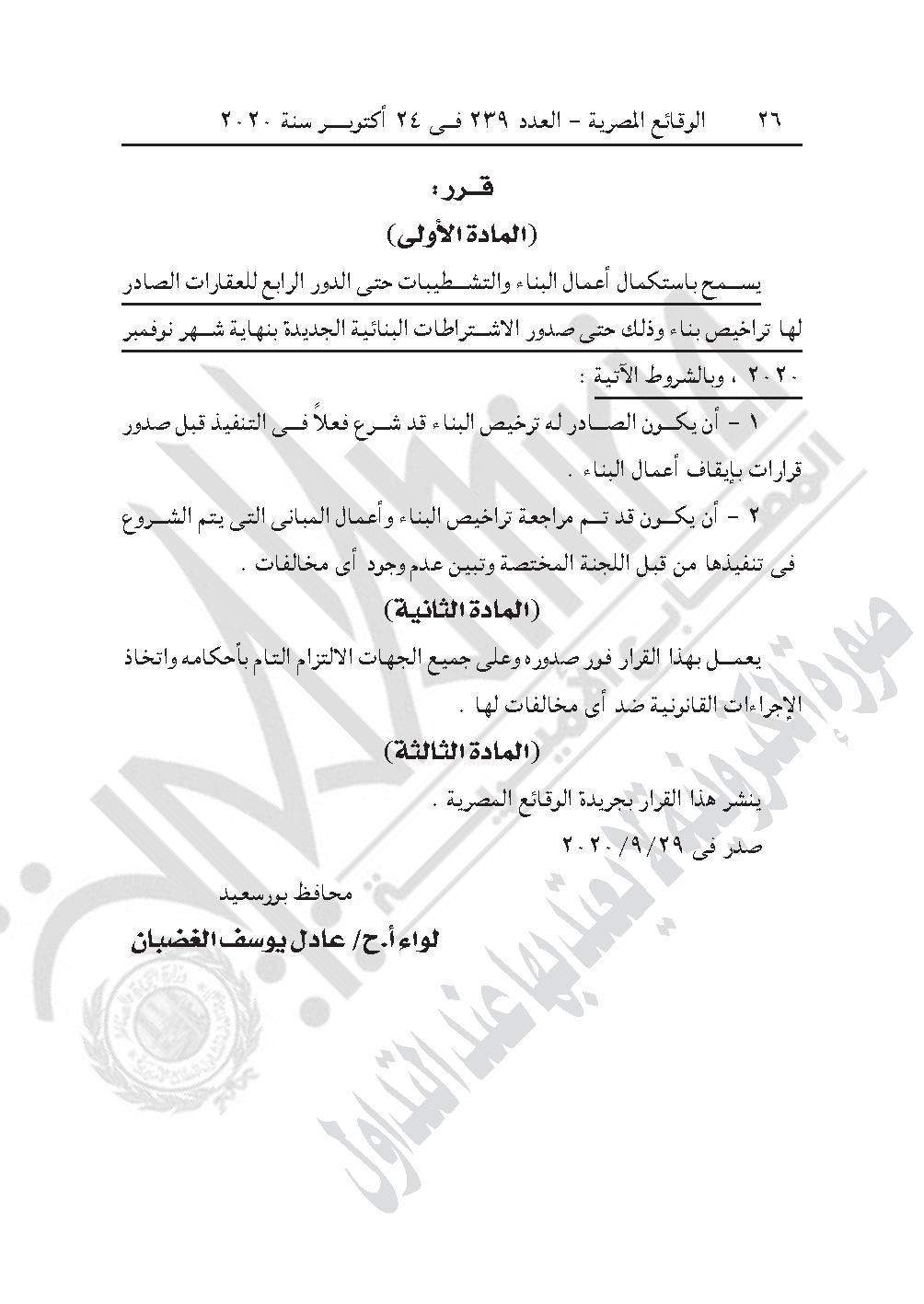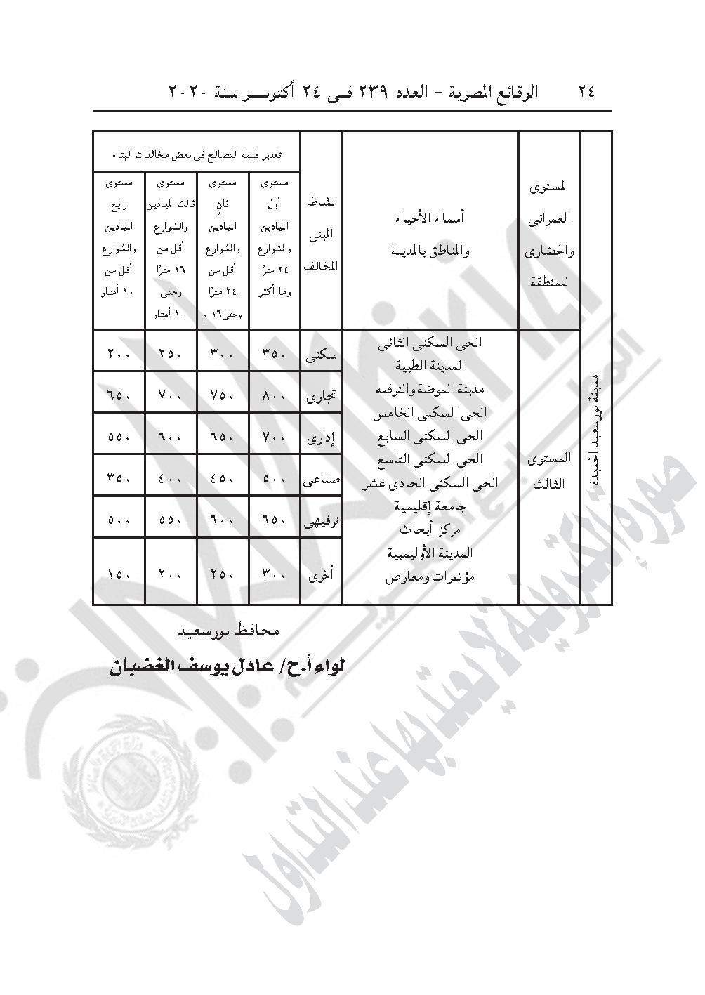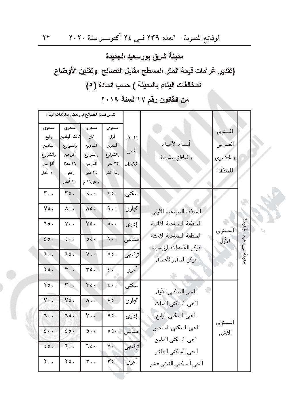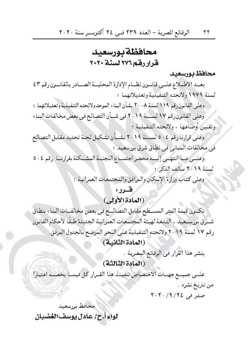 نشرت جريدة الوقائع المصرية في عددها رقم 239، الصادر في 24 أكتوبر 2020، قرارا محافظة بورسعيد بتحديد قيمة متر التصالح في مخالفات البناء بنطاق شرق بورسعيد، والسماح باستكمال أعمال البناء والتشطيبات حتى الدور الرابع للعقارات الصادر لها تراخيص بناء.