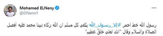 واكد النني من خلال هاشتاج "إلا رسول الله" أن الله زكى رسوله بقوله تعالى "انك لعلي خلقً عظيم"