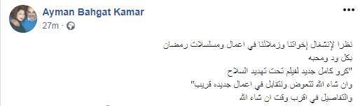 وكتب أيمن «نظرا لإنشغال إخواتنا وزملائنا في اعمال ومسلسلات رمضان بكل ود ومحبه "كرو كامل جديد لفيلم تحت تهديد السلاح وان شاء الله تتعوض ونتقابل في اعمال جديده قريب" والتفاصيل في اقرب وقت ان شاء الله».