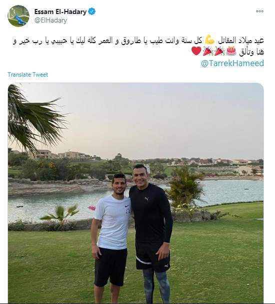 هنأ حارس مرمى الأهلي ومنتخب مصر السابق عصام الحضري اللاعب طارق حامد، نجم فريق الزمالك، بعيد ميلاده الـ32، قائلا: "العمر كله ليك يا حبيبي".