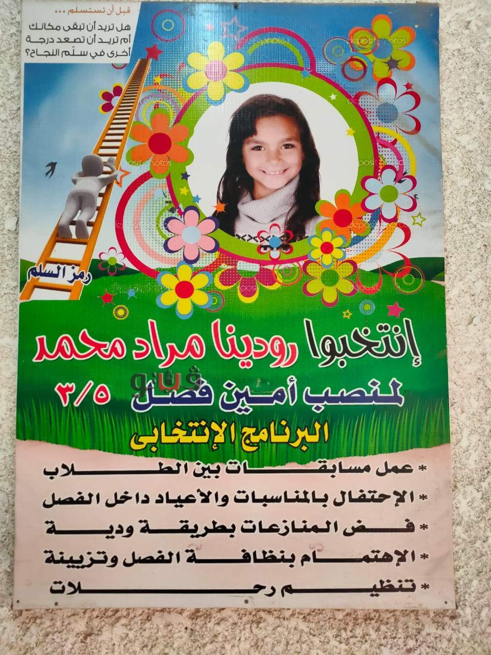 رودينا مراد طالبة بمدرسة الشهيد محمد أبو المجد الابتدائية رشحت نفسها لأمانة فصل 5/3 بالمدرسة وعلقت في أرجاء المدرسة لافتات مطبوعة تتضمن صورتها وبرنامجها وشعارها ورمزها الانتخابي، فاختارت رمز السلم ورفعت شعار "هل تريد أن تبقى مكانك أم تصعد درجة على السلم".