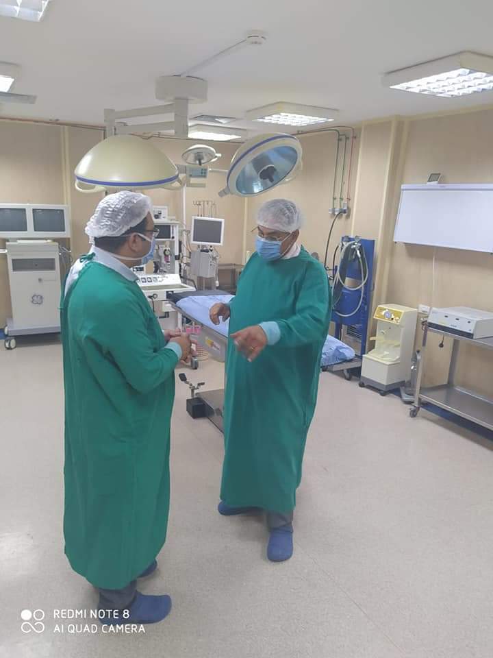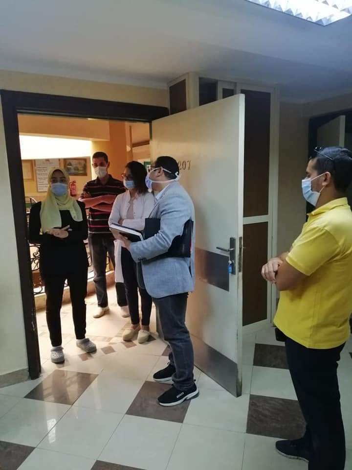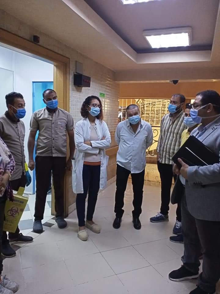 كما تفقد كافة اﻷقسام الداخلية والعيادات والاستقبال والطوارئ وأقسام العزل ، والتأكد من التزام الفرق الطبية بالأقسام المختلفة بارتداء الواقيات الشخصية والتأكد من مدي تدريبهم بالأقسام الداخلية والطوارئ وأقسام العزل وكيفية التعامل مع كافة حالات الاشتباه بفيروس كورونا المستجد .