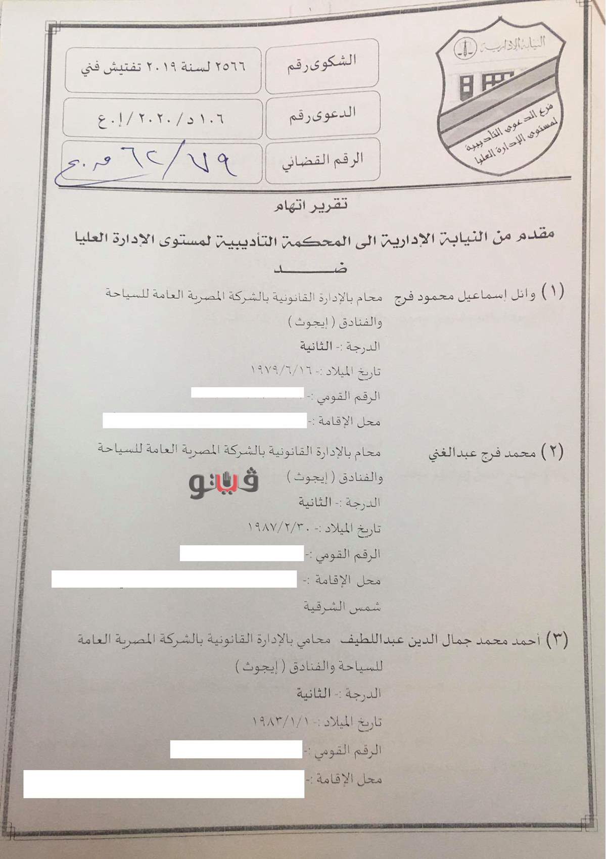 وتضم قائمة المحالين كلًا من: عادل عبد العزيز علي، نائب رئيس قطاع التنفيذ، بالشركة المصرية العامة للسياحة (إيجوث) وحسام إبراهيم محمد، مدير عام التحقيقات، وكلًا من وائل إسماعيل محمود ومحمد فرج عبد الغني وأحمد محمد جمال وعادل عبد العزيز علي وطه أبو الفتح طه وعمرو إبراهيم فاروق، المحامون بالشركة.
