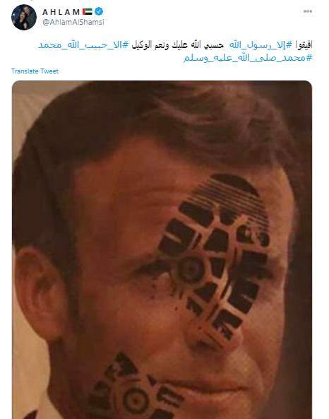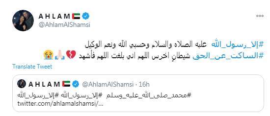 تفاعلت الفنانة الإماراتية أحلام مع هاشتاج "إلا رسول الله"، الذي دشنه نشطاء مواقع التواصل الاجتماعي للدفاع عن رسول الله صلي الله عليه وسلم ضد حملة الإساءة التي أطلقتها فرنسا من خلال رسوم كاريكاتيرية مسيئة للرسول، صلي الله عليه وسلم، لتقول أحلام إن الساكت عن الحق شيطان أخرس، ونشرت صورة للرئيس الفرنسي إيمانويل ماكرون مختومة بحذاء.