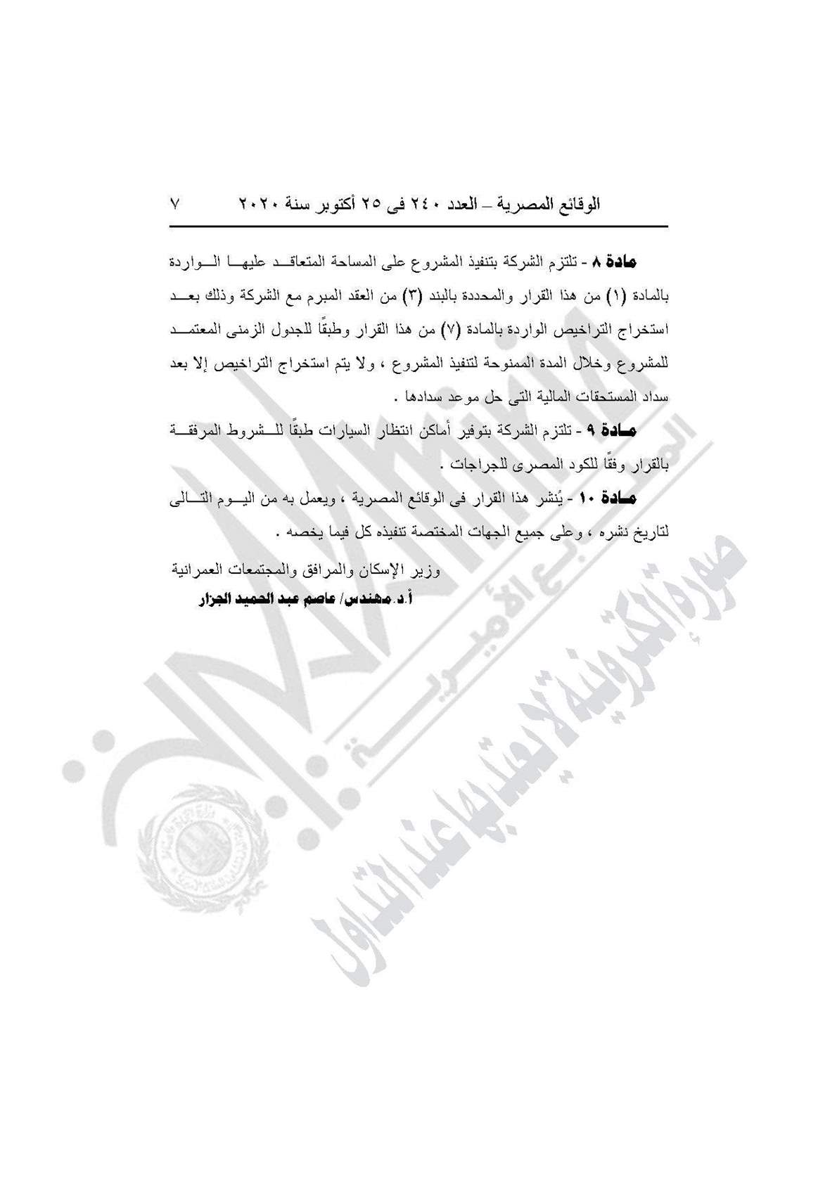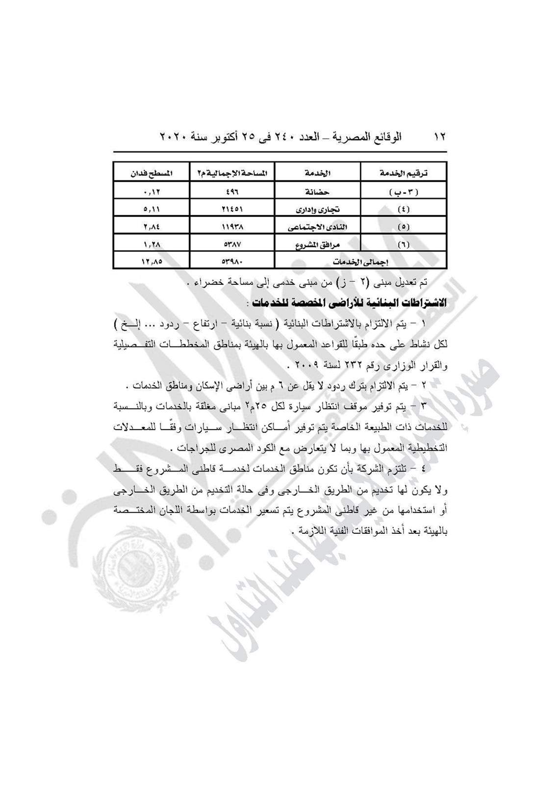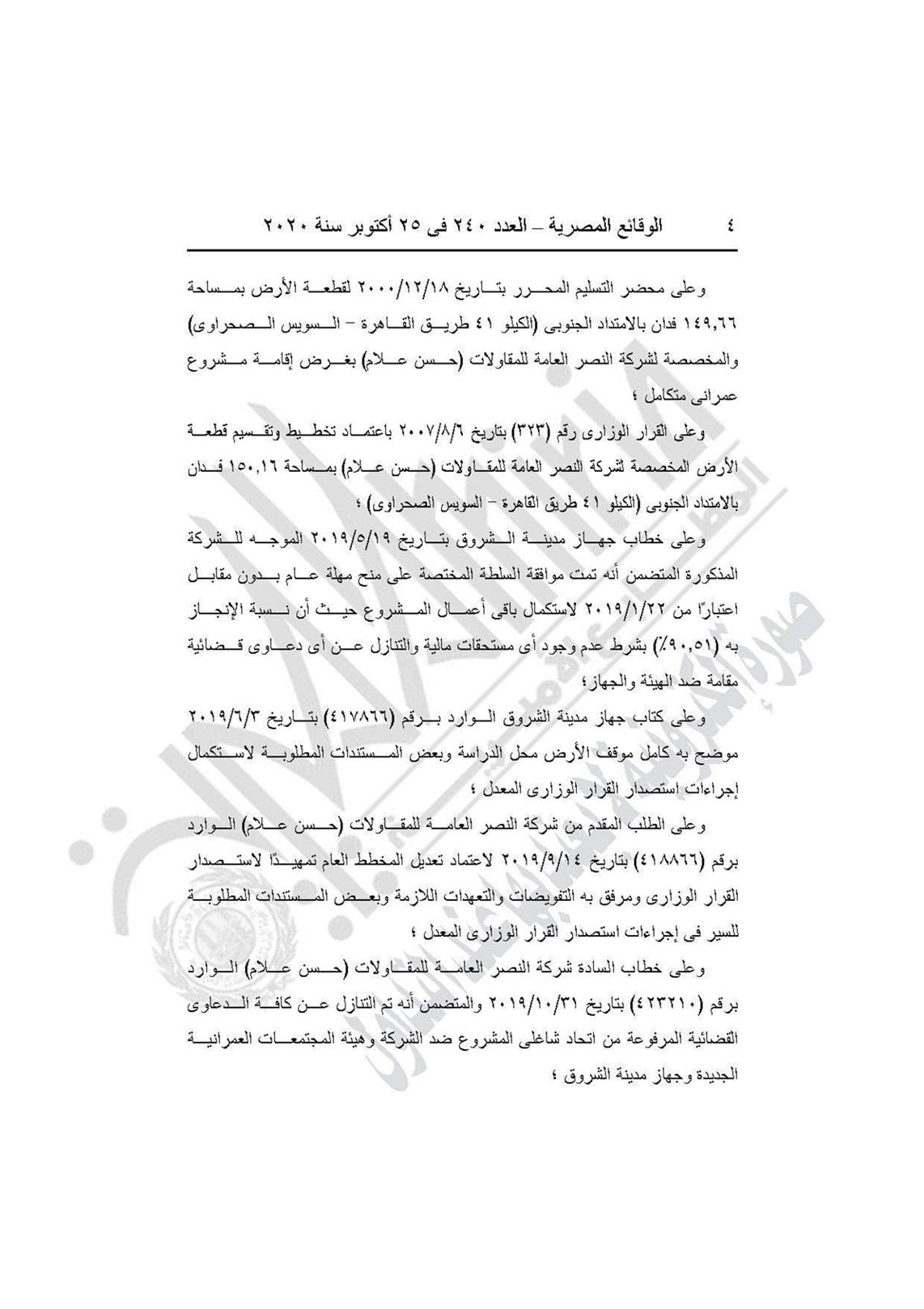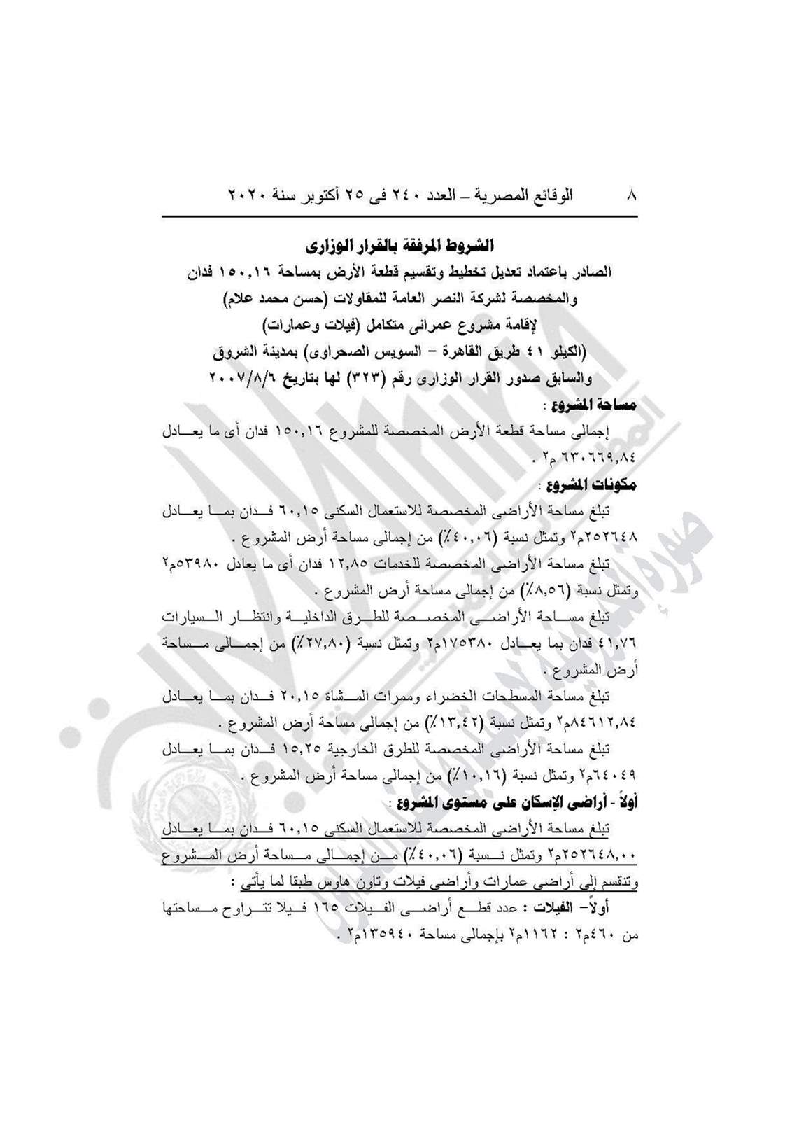 وينص القرار على اعتماد تعديل تخطيط وتقسيم قطعة الأرض بمساحة 150.16 فدان بالامتداد الجنوبي (الكيلو 41 طريق القاهرة- السويس الصحراوي) بمدينة الشروق المخصصة لشركة النصر العامة للمقاولات (حسن علام) والصادر لها القرار رقم (323) في 6/8/2007 لإقامة مشروع عمراني متكامل.