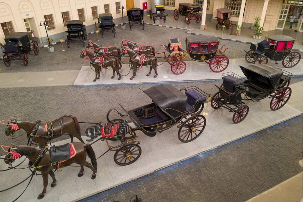 ويضم المتحف مجموعة رائعة من المقتنيات من أبرزها العربات الملكية مختلفة الأحجام والأنواع، والتي ترجع إلى فترة حُكم أسرة محمد علي باشا في مصر، كما يضم مجموعة من أطقم الخيول ولوازمها، بالإضافة إلى الملابس الخاصة بالعاملين بمصلحة الركائب والذين ترتبط وظائفهم بالعربات فضلًا عن مجموعة من اللوحات الزيتية للملوك والأميرات التي يرجع تأريخها إلى نفس الحقبة التاريخية.