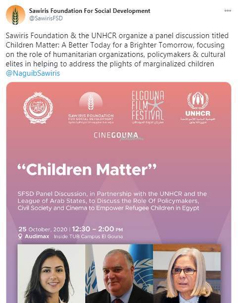 وكتبت مؤسسة ساويرس للتنمية الاجتماعية تغريدة على تويتر قالت فيها: "مؤسسة ساويرس والمفوضية السامية للأمم المتحدة لشؤون اللاجئين تنظمان حلقة نقاشية بعنوان (مشكلة الأطفال.. اليوم أفضل لغد أكثر إشراقًا)، مع التركيز على دور المنظمات الإنسانية وصانعي السياسات والنخب الثقافية في المساعدة على معالجة محنة الأطفال المهمشين".