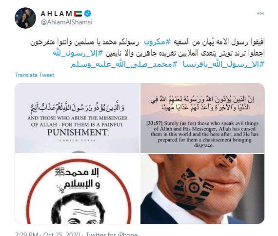 هاجمت الفنانة الإماراتية أحلام الرئيس الفرنسي إيمانويل ماكرون لإهانته للدين الإسلامي، وطالبت متابعيها بأن ينشروا هاشتاج "إلا رسول الله".