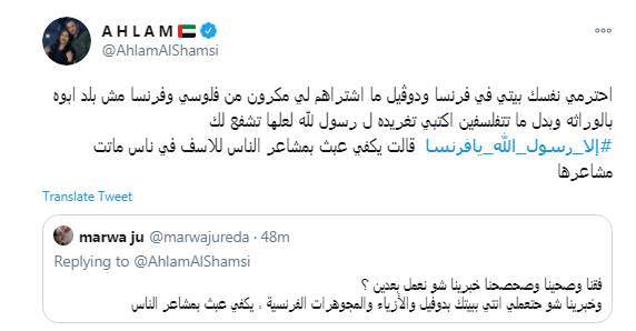 وكتبت أحلام تغريدة على تويتر: "افيقوا .. رسول الأمة يُهان من السفيه #ماكرون .. رسولكم محمد يا مسلمين وانتوا متفرجون اجعلوا ترند تويتر يتعدى الملايين تغريده جاهزين والا نايمين #إلا_رسول_لله #إلا_رسول_الله_يافرنسا #محمد_صلى_الله_عليه_وسلم".