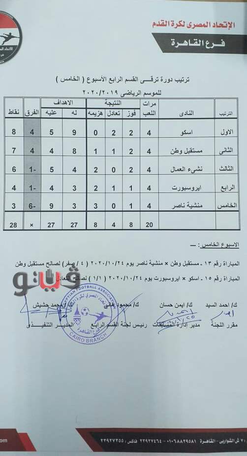 وأعتمد محمد حشيش المدير التنفيذي لمنطقة القاهرة، والمهندس محمود هاني رئيس لجنة مسابقات القسم الرابع وأيمن حسان مدير إدارة المسابقات وأحمد السيد مقرر اللجنة، جدول الترتيب.