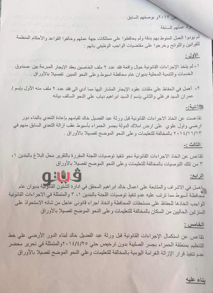 وتبين أن خالد إبراهيم طه، باحث قانوني بديوان المحافظة تقاعس عن اتخاذ الإجراءات القانونية نحو تنفيذ توصيات اللجنة بالبندين 1 و 3 والمتمثلة في الإجراءات القانونية الواجب اتخاذها للحفاظ على مستحقات جهة عمله واتخاذ إجراء قانوني للاستحواذ على المنزلين من السكان.