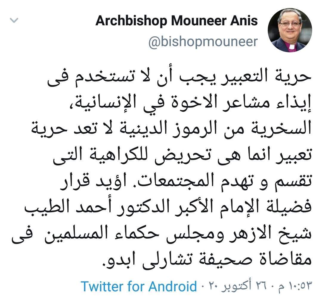 وقال المطران منير حنا في تدوينة له عبر موقع التواصل الاجتماعي "تويتر" : "حرية التعبير يجب أن لا تستخدم فى إيذاء مشاعر الأخوة في الإنسانية، السخرية من الرموز الدينية لا تعد حرية تعبير إنما هي تحريض للكراهية التي تقسم و تهدم المجتمعات.