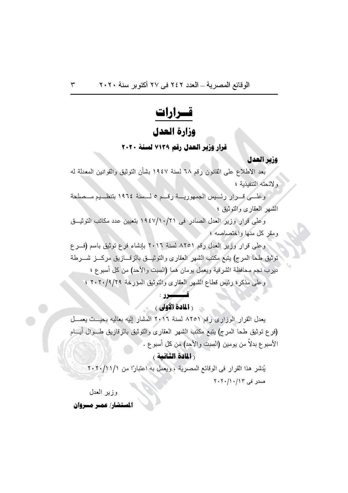 وحمل القرار رقم 7139 لسنة 2020، بتعديل القرار الوزاري رقم 8251 لسنة 2016، "بإنشاء فرع توثيق باسم فرع توثيق طحا المرج يتبع مكتب الشهر العقاري والتوثيق بالزقازيق مركز شرطة ديرب نجم محافظة الشرقية ويعمل يومين السبت والأحد"، بحيث يعمل فرع توثيق طحا المرج طوال أيام الأسبوع بدلا من يومين.