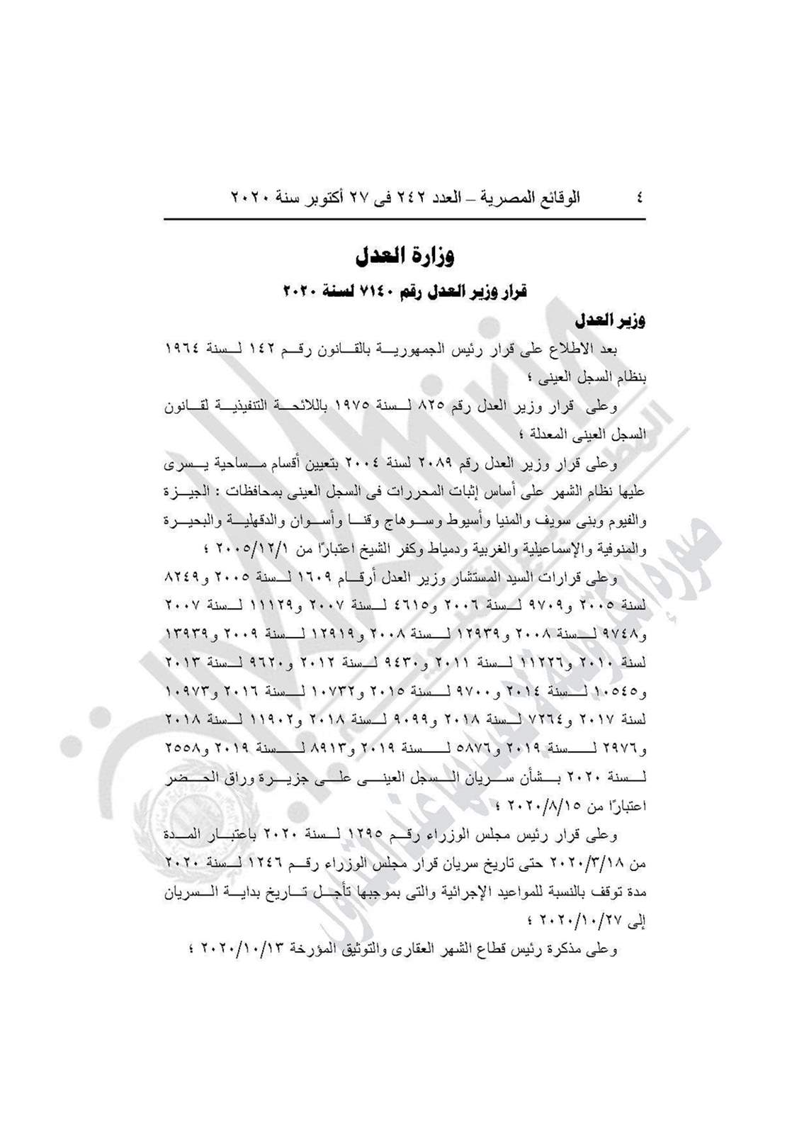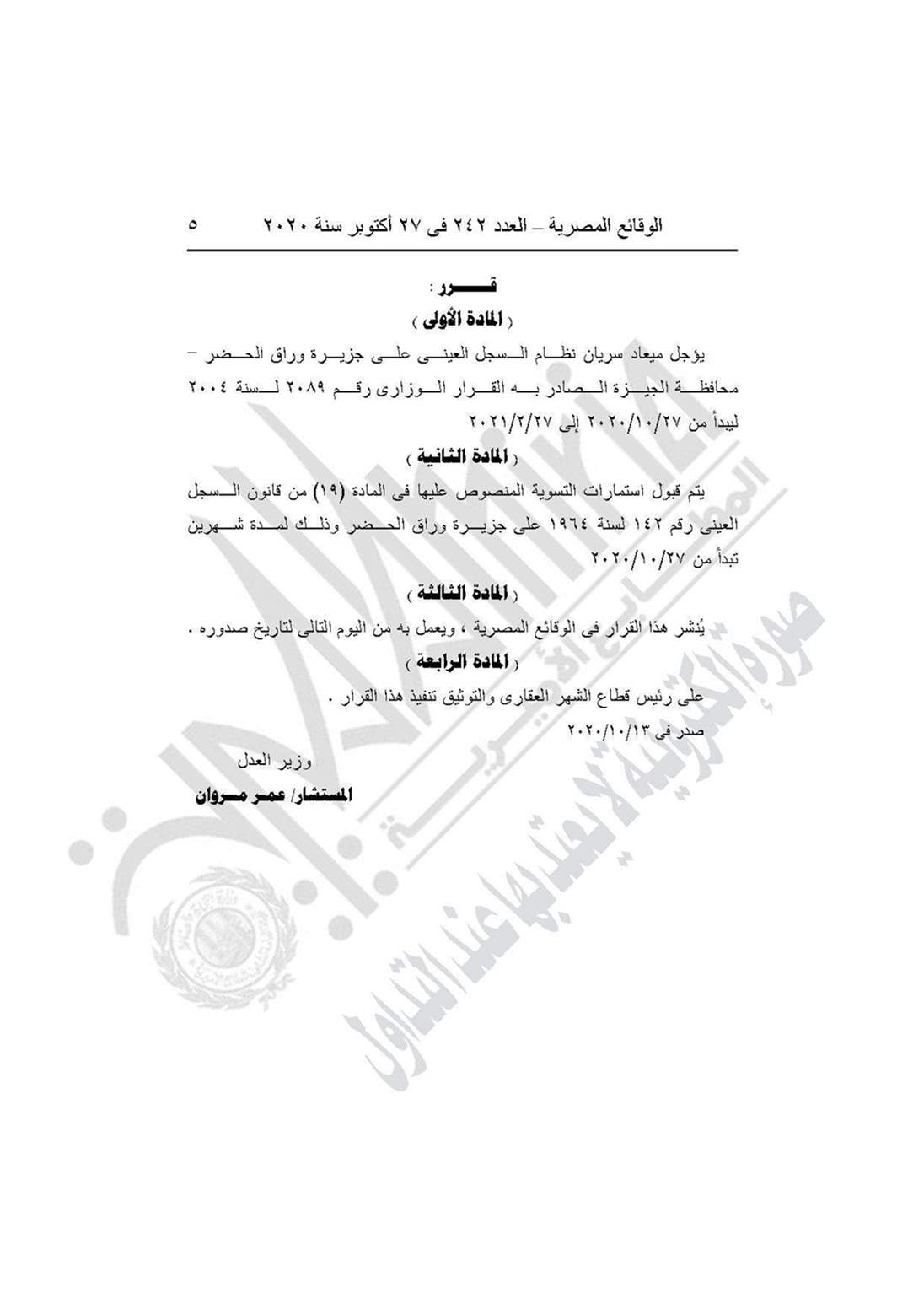 والقرار رقم 7140 لسنة 2020، بتأجيل ميعاد سريان نظام السجل العيني على جزيرة الوراق، محافظة الجيزة الصادر به القرار الوزارى رقم 2089 لسنة 2004 ليبدأ من 27/10/2020 إلى 27/2/2021.