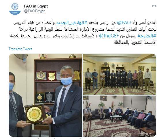 وكتبت منظمة الأغذية والزراعة "فاو" تغريدة على تويتر " اجتمع أمس وفد الفاو @FAO مع رئيس جامعة #الوادي_الجديد وأعضاء من هيئة التدريس لبحث آليات التعاون لتنفيذ أنشطة مشروع الإدارة المستدامة للنظم البيئية الزراعية بواحة #الخارجة بتمويل من صندوق البيئة العالمي @theGEF والاستفادة من إمكانيات وخبرات ومعامل الجامعة لخدمة الأنشطة التنموية بالمحافظة"