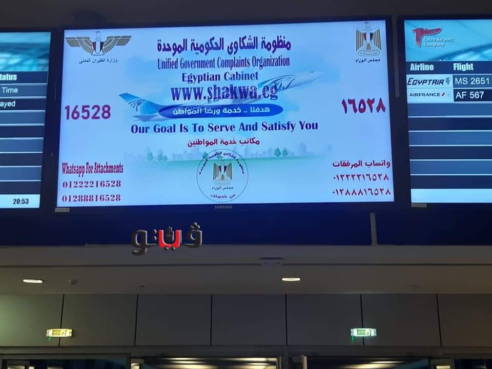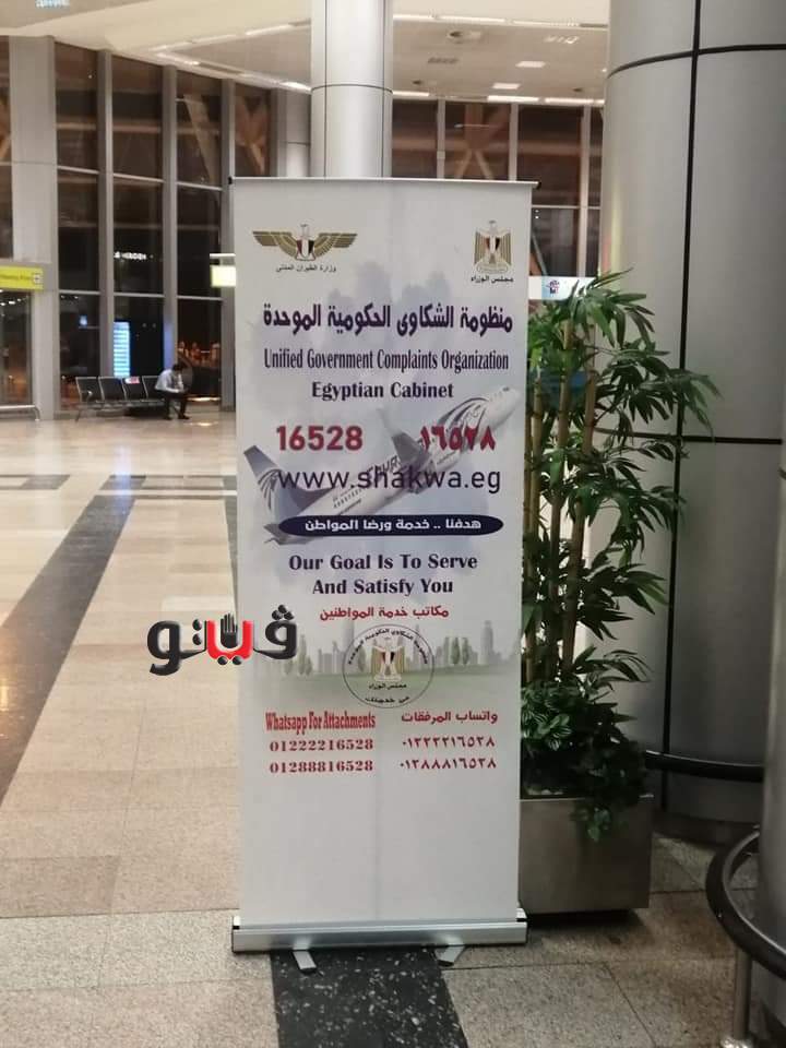 وقد تم وضع اللافتات واللوحات الإرشادية برقم الخط الساخن والموقع الالكتروني الخاص بالشكاوى وعلى شاشات العرض بجميع مبانى الركاب بمطار القاهرة الدولى وجارى تعميمها بجميع مطارات الجمهورية .